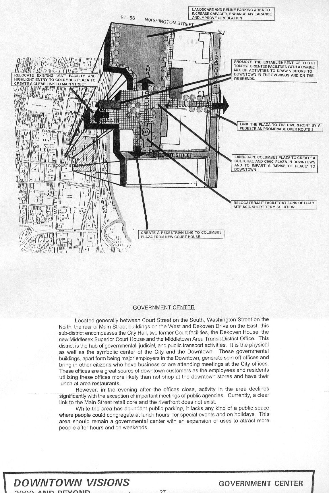 Located generally between Court Street on the South, Washington Street on the North, the rear of Main Street buildings on the West and DeKoven Drive on the East, this sub-district encompasses the City Hall, two former Court facilities, the DeKoven House, the new Middlesex Superior Court House and the Middletown Area Transit District Office. This district is the hub of governmental, judicial, and public transport activities. It is the physical as well as the symbolic center of the City and the Downtown.