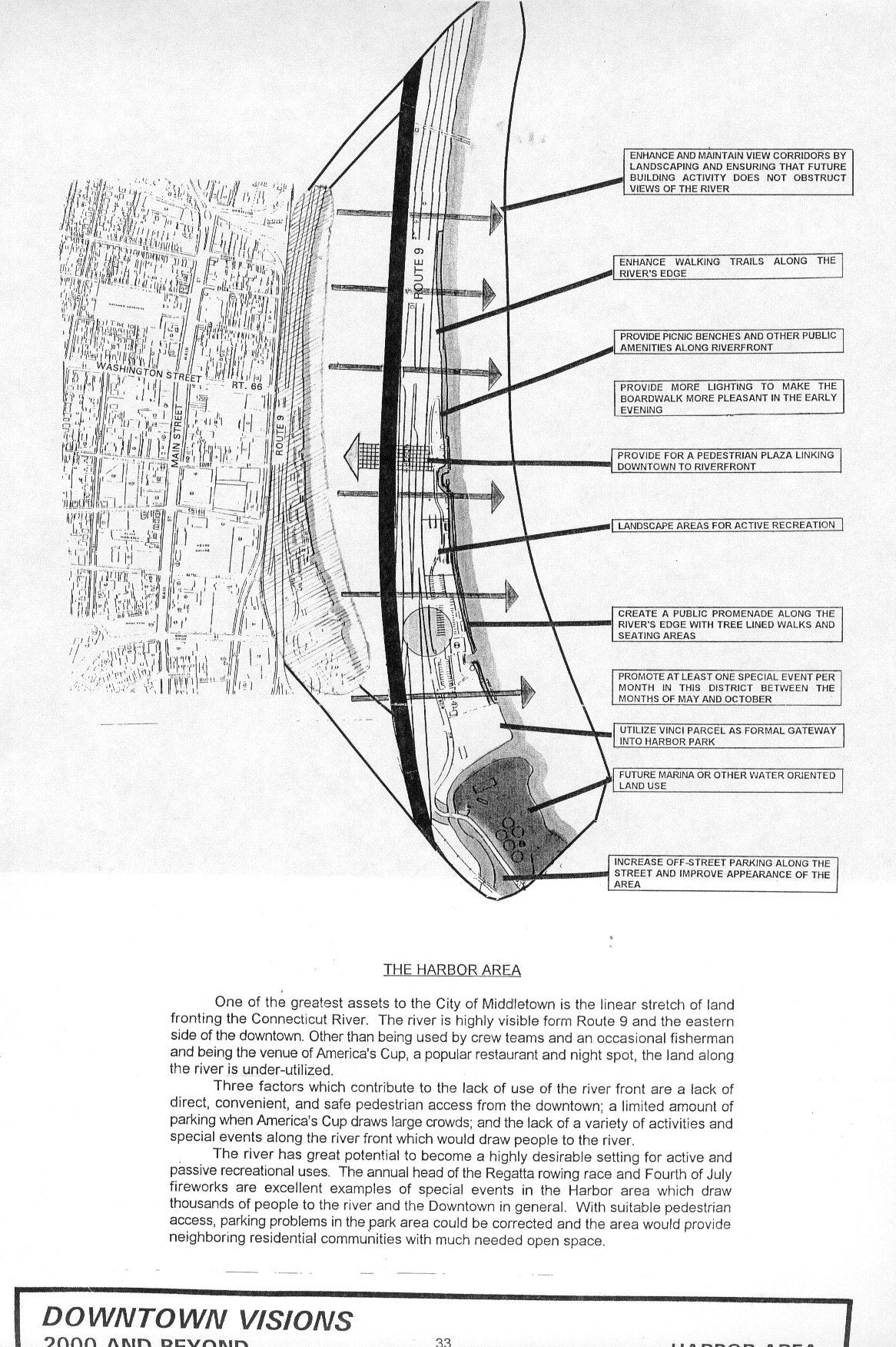 The river has great potential to become a highly desirable setting for active and passive recreational uses. The annual head of the Regatta rowing race and Fourth of July fireworks are excellent examples of special events in the Harbor area which draw thousands of people to the river and the Downtown in general. With suitable pedestrian access, parking problems in the park area could be corrected and the area would provide neighboring residential communities with much needed open space.